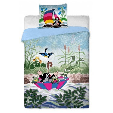 - Na ložním povlečení je Krteček s žabkami,který pluje po řece v deštníku s doprovodem ptáčků.