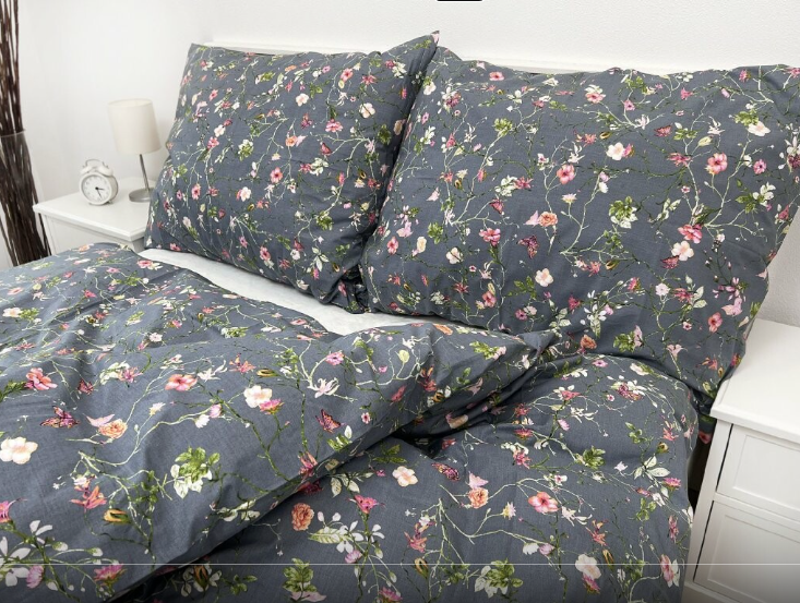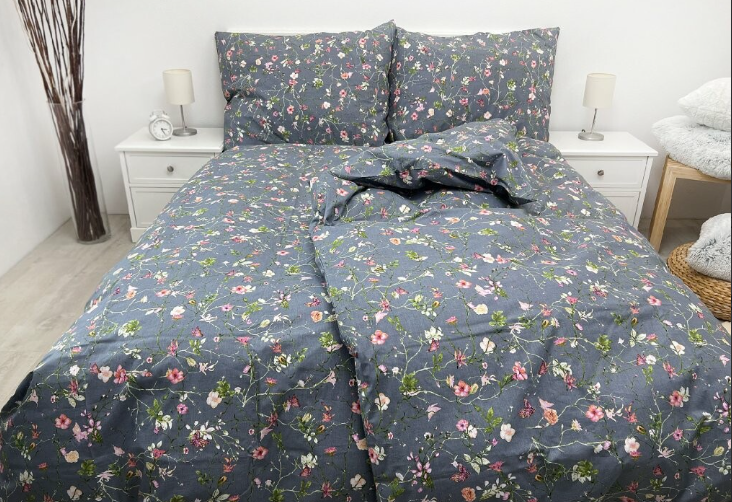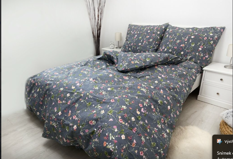 - Povlečení je laděno do šedých odstínů s motivy drobných kvítek, pokryté přes celou šíři látky.