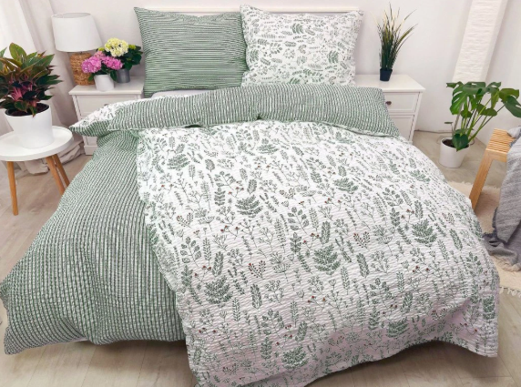 - Vzorem povlečení jsou zelené květy na bílém podkladu.Druhá strana povlečení