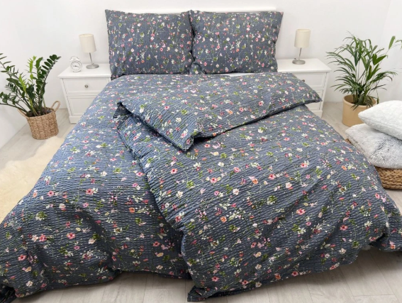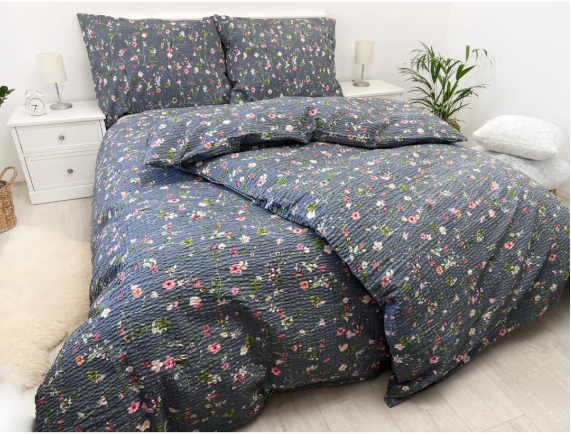 - Povlečení je laděno do šedých odstínů s motivy drobných kvítek, pokryté přes celou šíři látky.